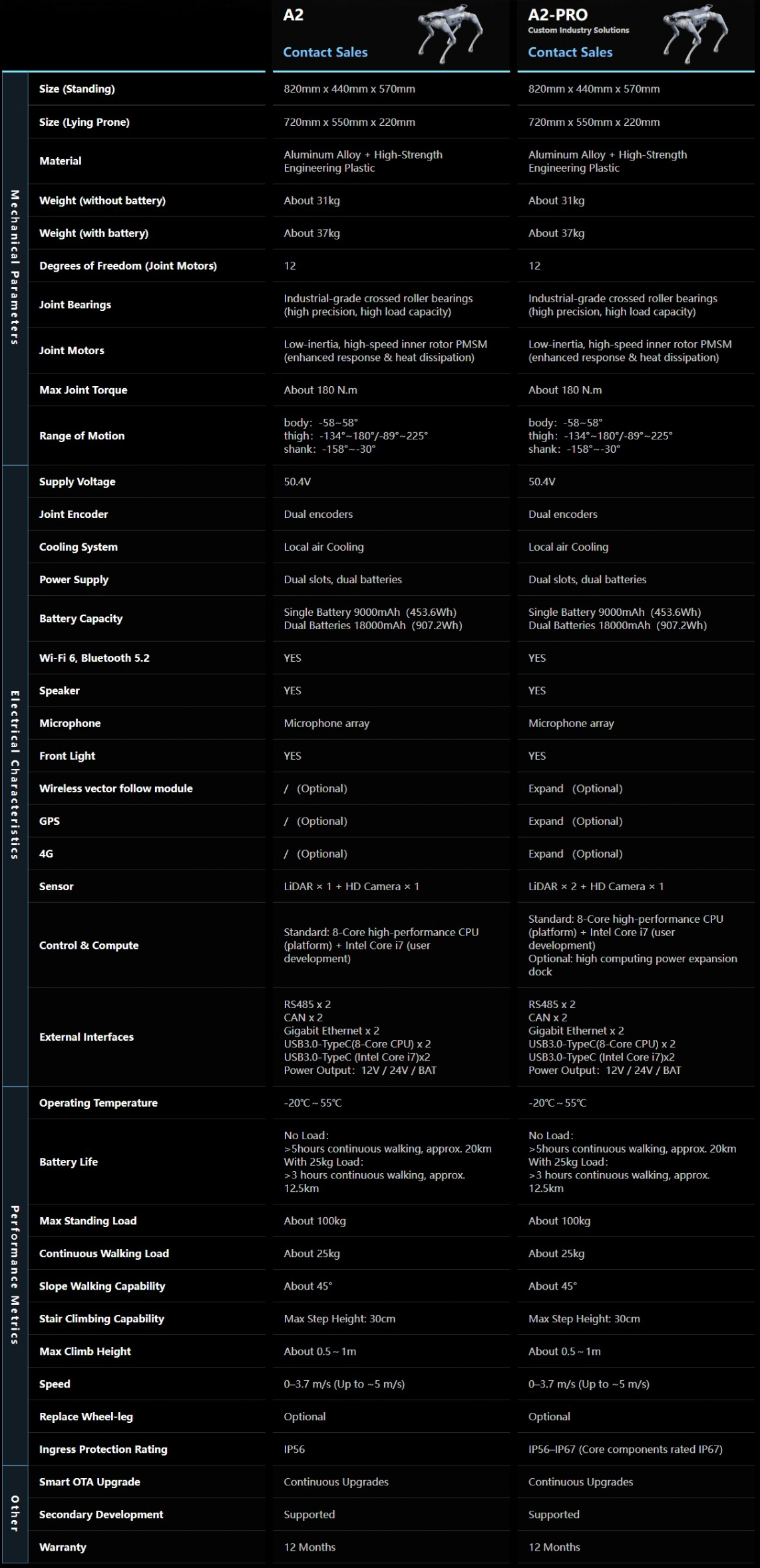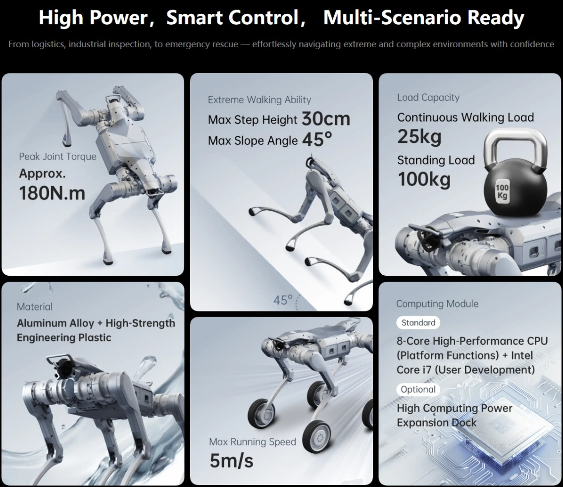 [4] This quadruped robot has a complex structure and powerful dynamics. Users must keep a safe distance from the robot at all times. Please use with caution.
